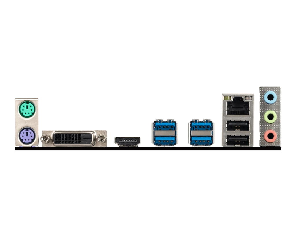 1x Mouse 1x DVI-D Port 2x USB 3.2 Gen1 1x LAN Port 1x Keyboard 1x HDMI™ Port 2x USB 2.0 Ports 1x HD Audio