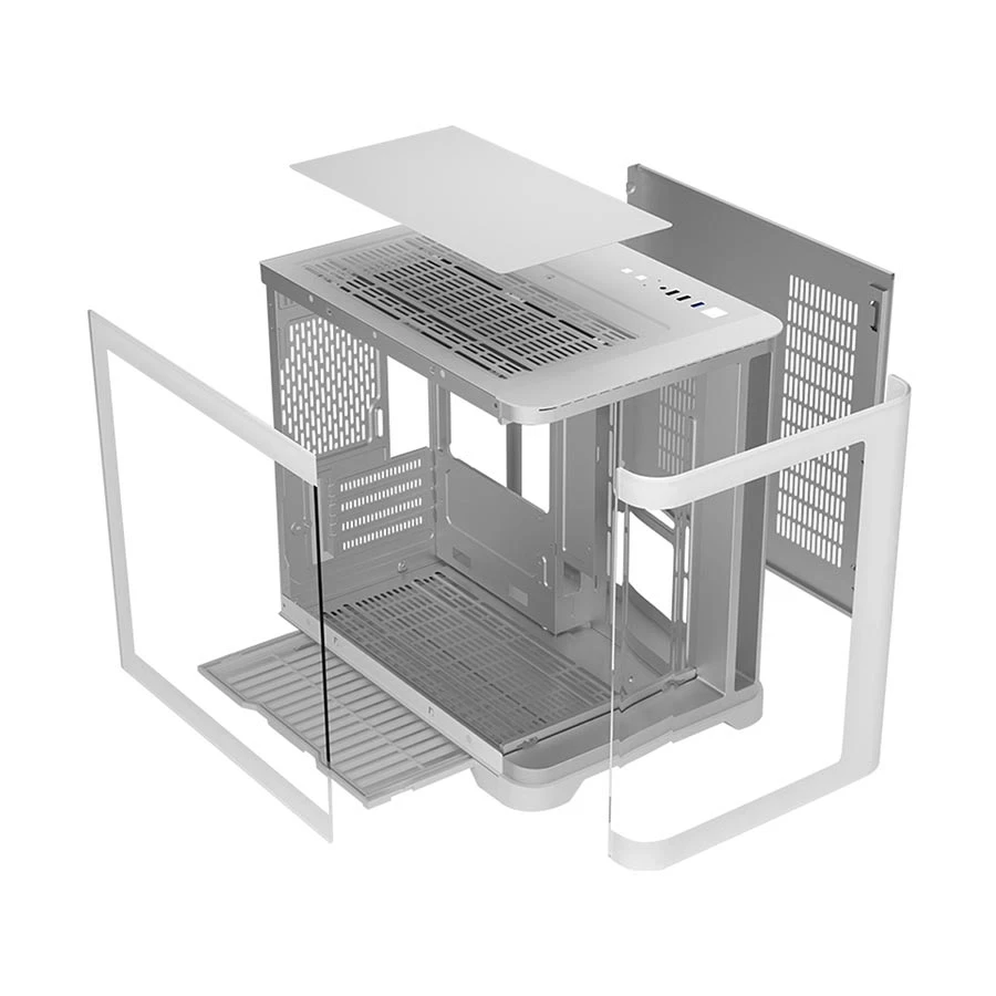 rear) with a hub/controller. Its U-shaped tempered glass front and left panels
