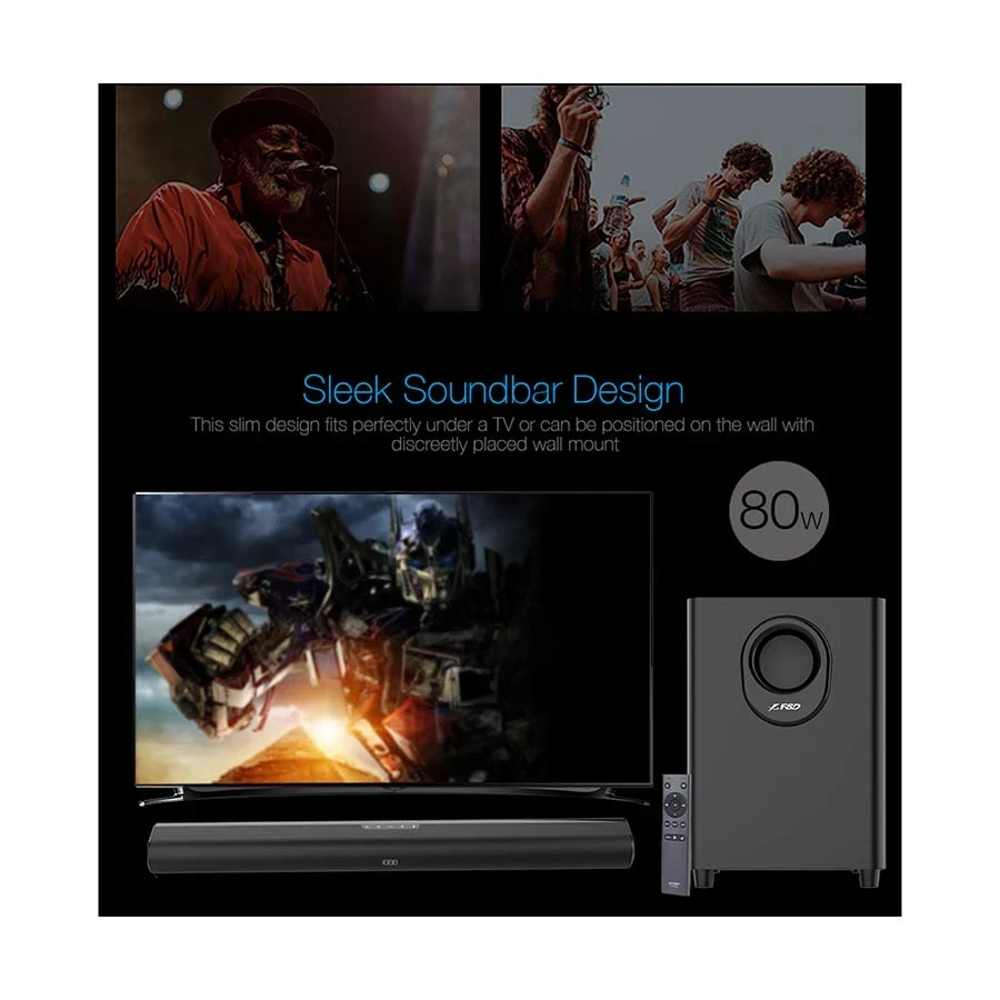 The F&D HT-330 is a powerful and elegantly designed 2.1 channel home theater speaker system built for users who demand immersive sound and modern connectivity in a compact package. Delivering 80W total output power, this speaker system is suitable for home entertainment setups, delivering room-filling audio whether you're watching movies, streaming music, or playing games. With support for both wired and wireless connections, the HT-330 balances convenience with high performance.