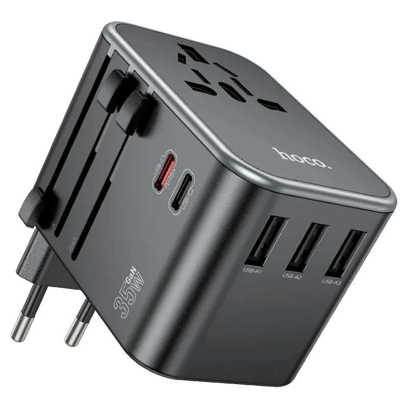 Travel Adapter with 2 × USB-C, 3 × USB-A ports, and 1 × AC socket |