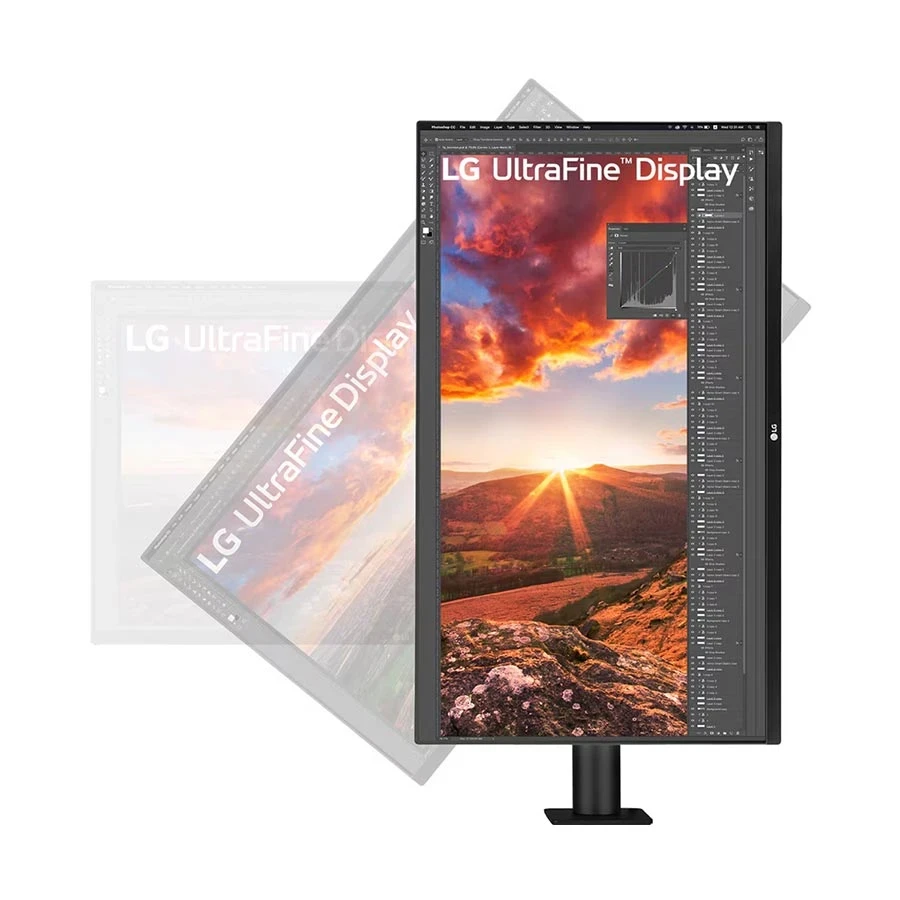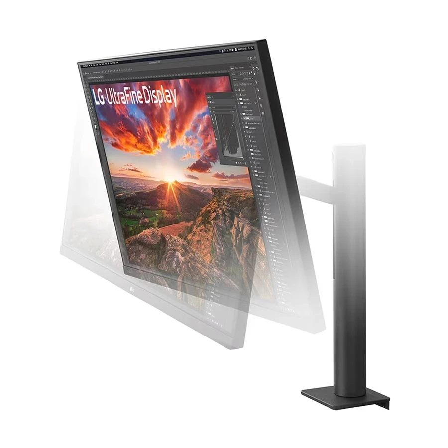 ‣ Ergonomic Stand – LG Ergo Arm (Height, Pivot, Tilt, Swivel)