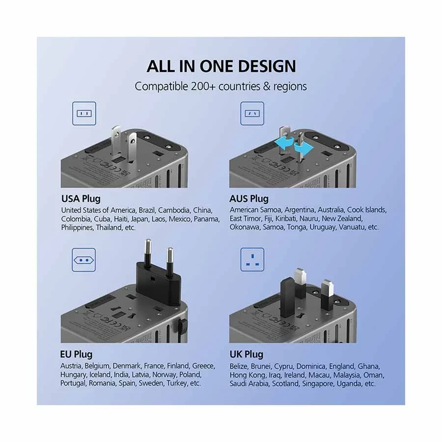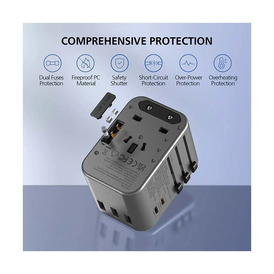 and Asia. With multiple ports and built-in safety features, this adapter makes