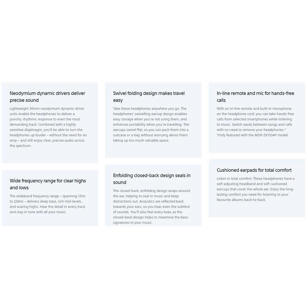 (MDR-ZX110AP only); wide frequency range for rich sound; closed-back design