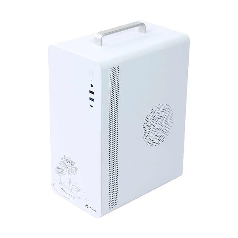 handle for portability. This mid-tower supports Micro ATX and Mini-ITX motherboards,